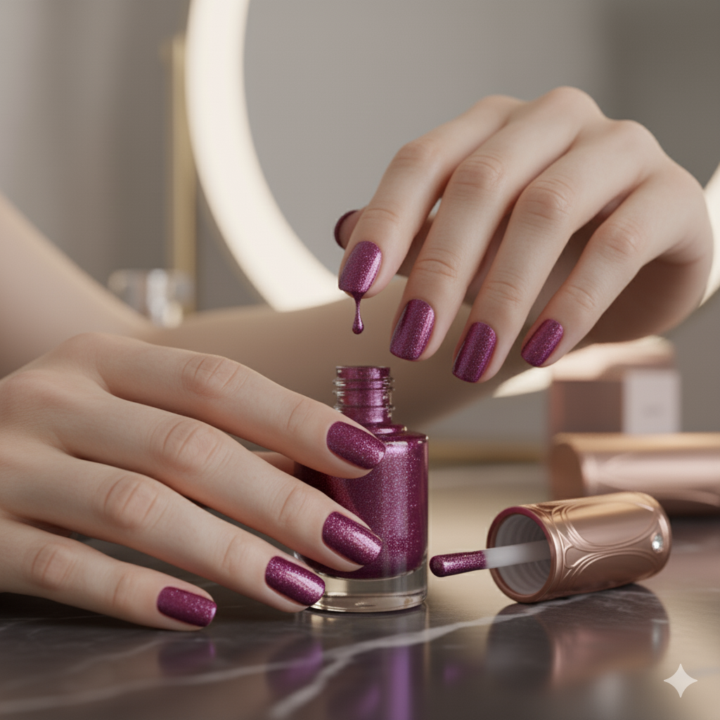 A glittery magenta/pink nail polish